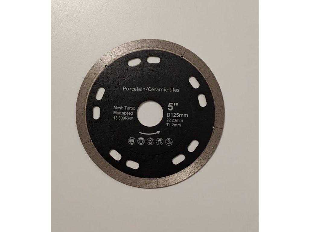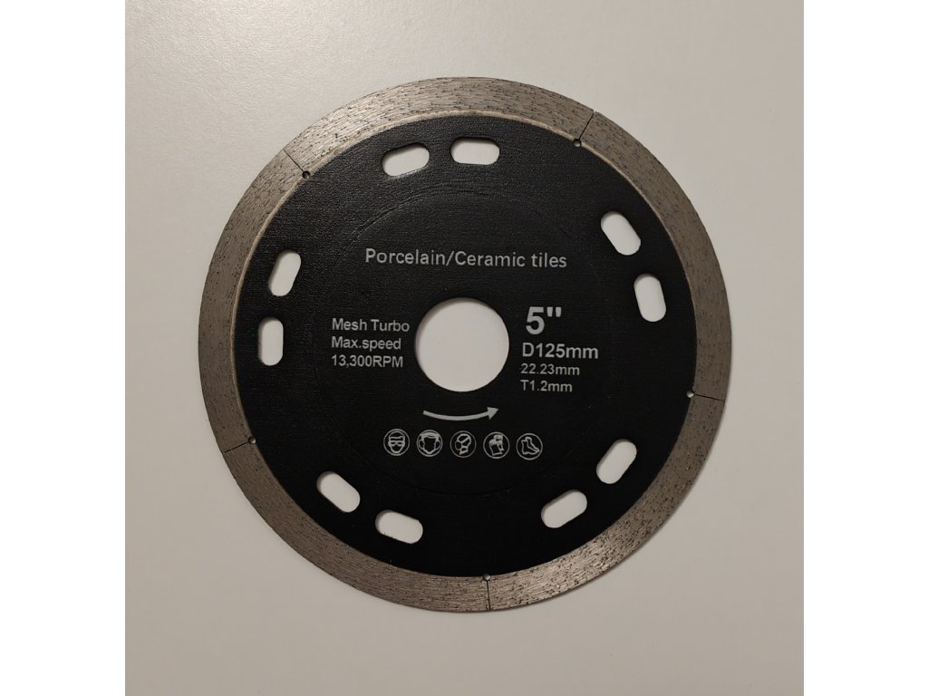 Profesionální diamantový kotouč o průměru 125 mm (5") určený pro řezání porcelánu a keramických obkladů. Díky turbo síťovanému segmentu (Mesh Turbo) zajišťuje čistý, přesný a rychlý řez bez odštěpů. Ideální pro suché i mokré řezání.