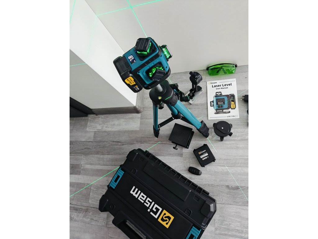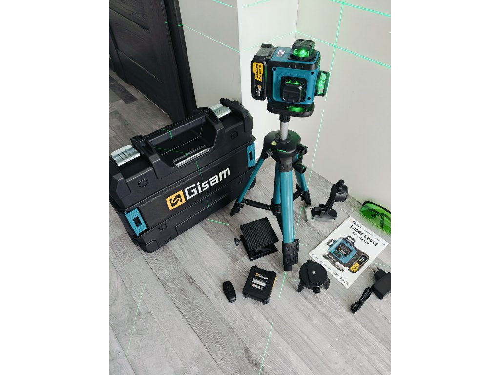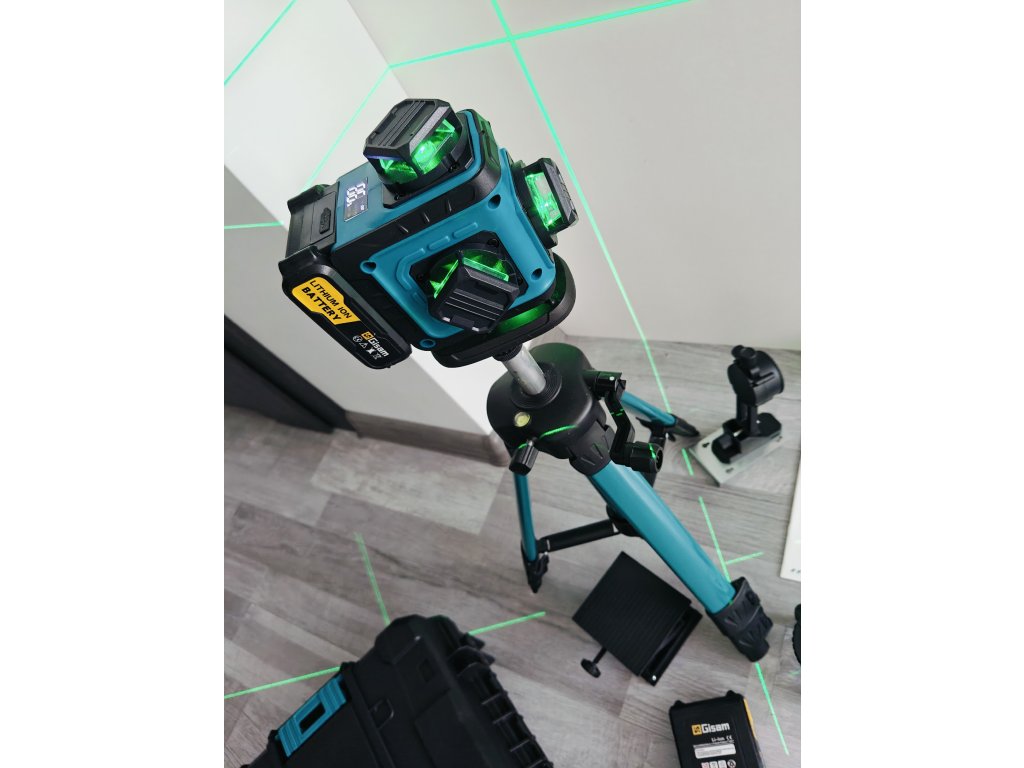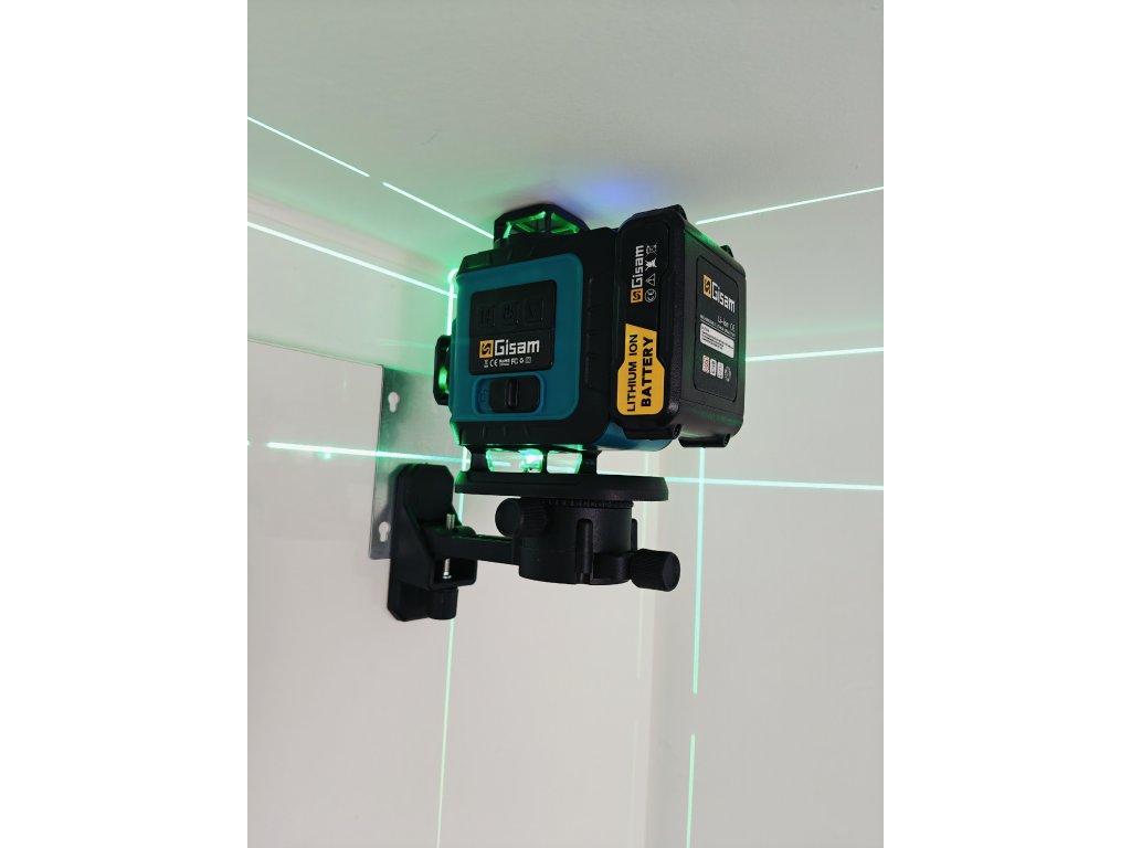 Profesionální samonivelační křížový laser Gisam s jasným zeleným paprskem a 16 liniemi. Ideální pro pokládku dlažby, obklady, sádrokarton, montáž nábytku i stavební práce.