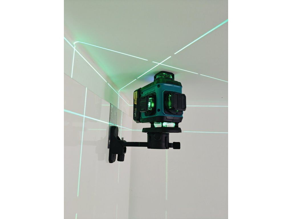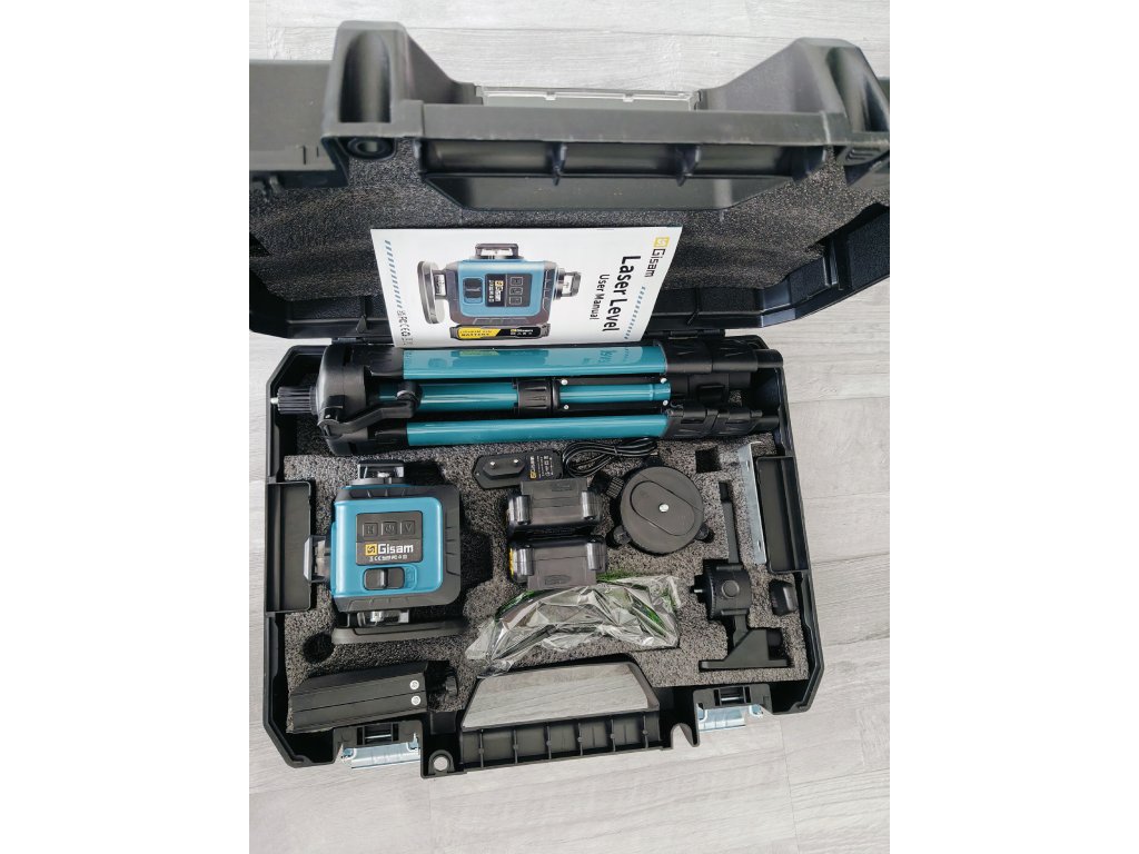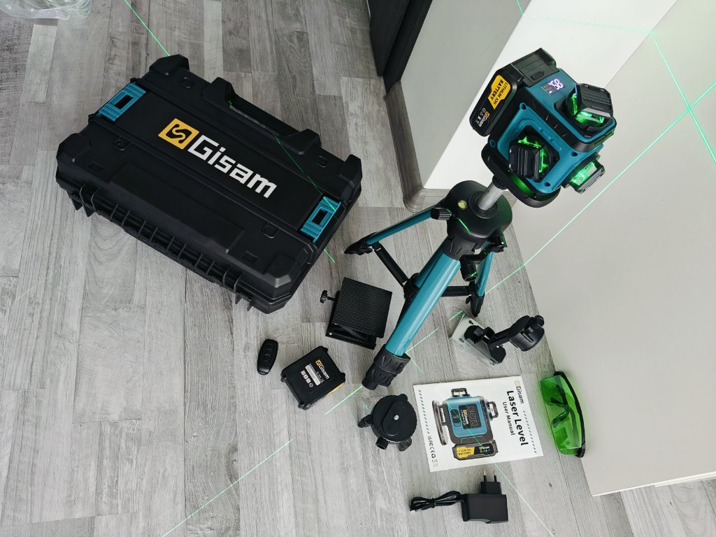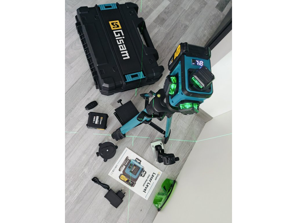 Profesionální samonivelační křížový laser Gisam s jasným zeleným paprskem a 16 liniemi. Ideální pro pokládku dlažby, obklady, sádrokarton, montáž nábytku i stavební práce.