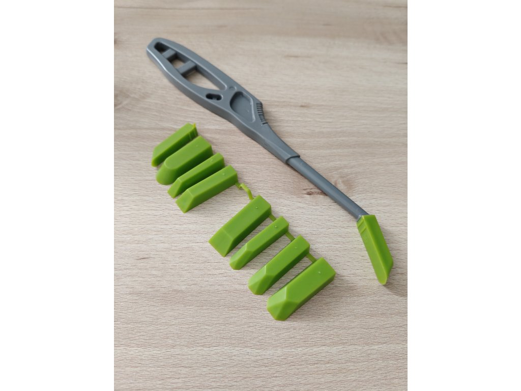 Sada pružných stěrek různých tvarů na stahování silikonu. Na rukojeť si nasadíte dle vašeho výběrua velkou výhodou je, že se dostanete i do hůře dostupných míst.